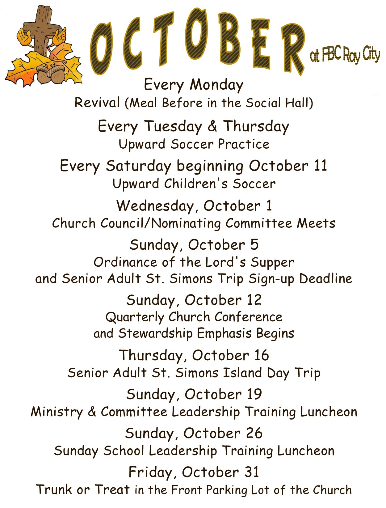 Welcome to the First Baptist Church of Ray City 457 Pauline Ave, Ray City, GA 31645 | 229.455.4021 New Here? Upcoming Events Oct 13 7:00 pm - 8:00 pm Revival (Meal served at 6 pm) Oct 14 5:30 pm - 7:30 pm O.C.: Upward Kids Soccer Practice (Tuesdays & Thursdays thru November 20) Oct 16 6:45 am - 6:00 pm Senior Adult Trip – St. Simons – Be at the Church at 6:45 am! Oct 16 5:30 pm - 7:30 pm O.C.: Upward Kids Soccer Practice (Tuesdays & Thursdays thru November 20) Oct 18 9:00 am - 11:00 am O.C.: Upward Kids Soccer (Saturdays thru November 22) View Calendar REGULAR SCHEDULE SUNDAYS Sunday School 9:45 AM Worship Service 11 AM WEDNESDAYS Bible Study (All Ages) 7 PM Our purpose statement is in our logo… Christ has called every individual believer to join into the body of Christ. Let’s find where you can plug into our Church Family. D-Life Seniors Men Women Youth Children Weekly Newsletter Beacon25_10_14 Latest Message WATCH! Ray City 150th Anniversary SlideShow How do I Become a Christian? What does it mean to be a Christian?